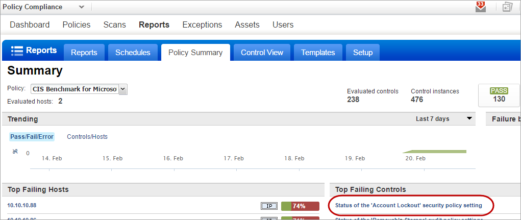 You can quickly run interactive reports from the Policy Summary. Click any control (under Top Failing Controls) to run the Control Pass/Fail report. Show meShow me