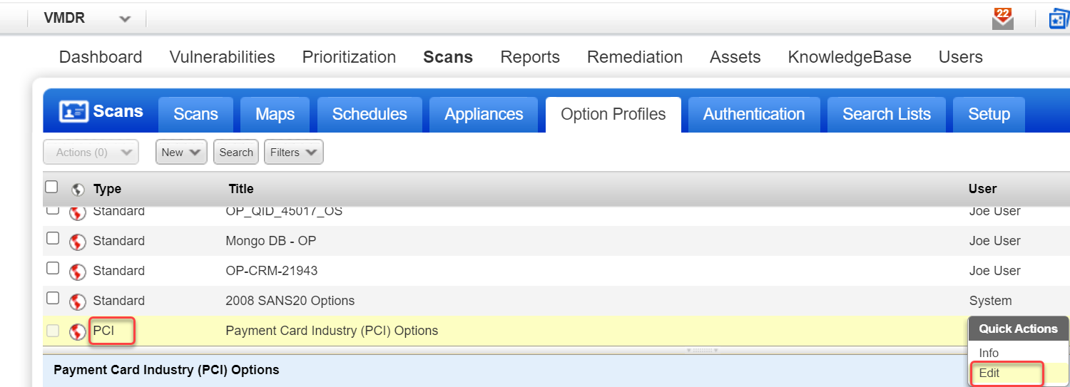 2b - To make changes to an existing PCI option profile, select a PCI option profile in the list and choose Edit from the Quick Actions menu.