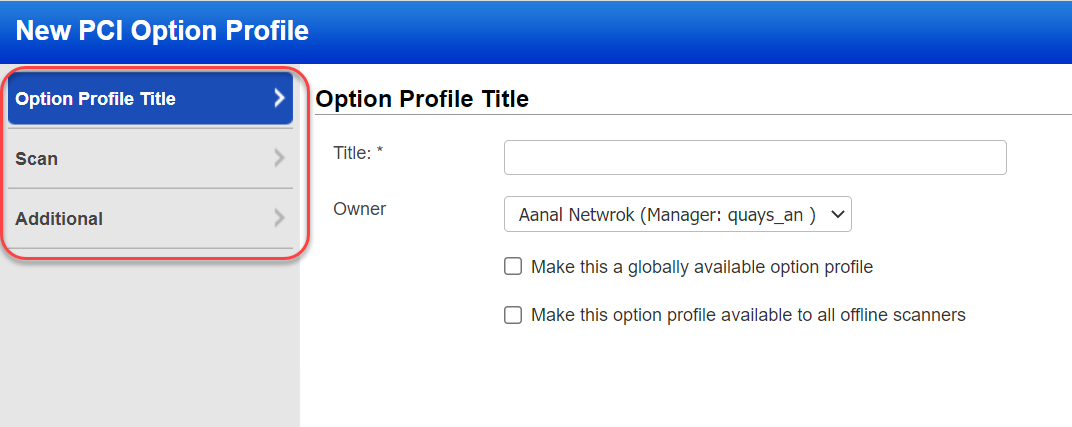 Option Profile Title - This section has basic settings for the PCI option profile like title, owner and global setting.
