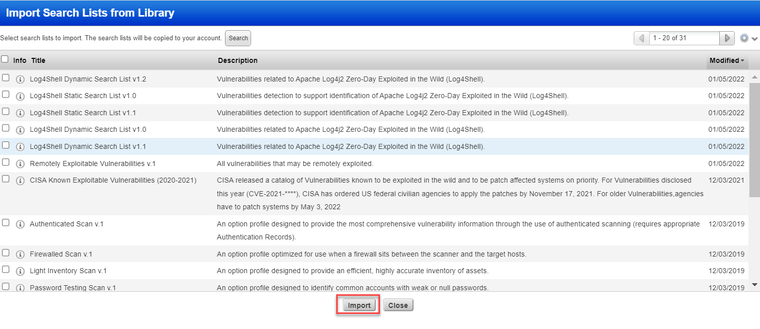 3) The Import Search Lists from Library window appears. Select one or more Search lists in the list, and then click Import to add the selected Search lists to your account.