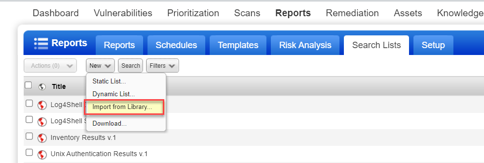 We provide Static & Dynamic Search Lists in our Library, which are available for import. You can import Search Lists into your account and use them as-is or edit them as needed. Note the Library is updated regularly with new configurations.