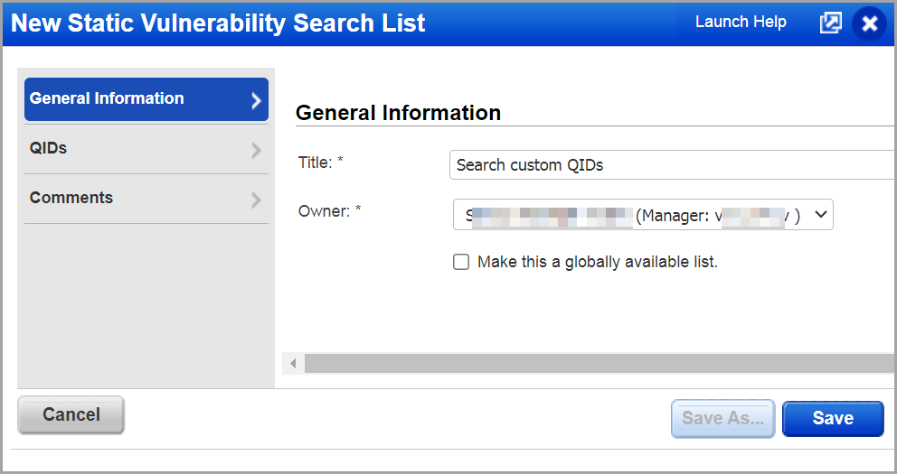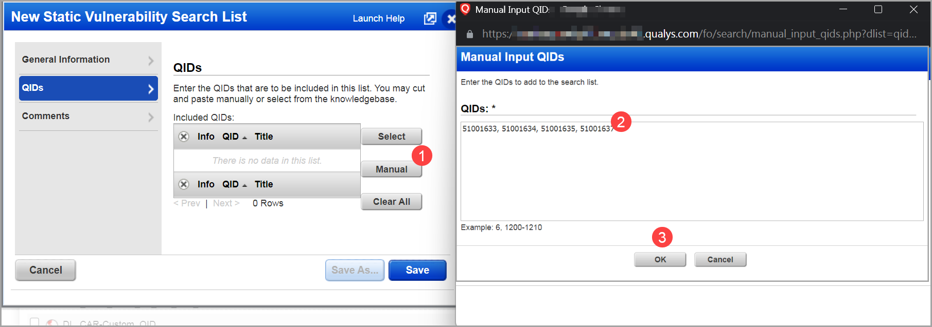 The example here demonstrates to create the static search list for custom vulnerabilities (QIDs).