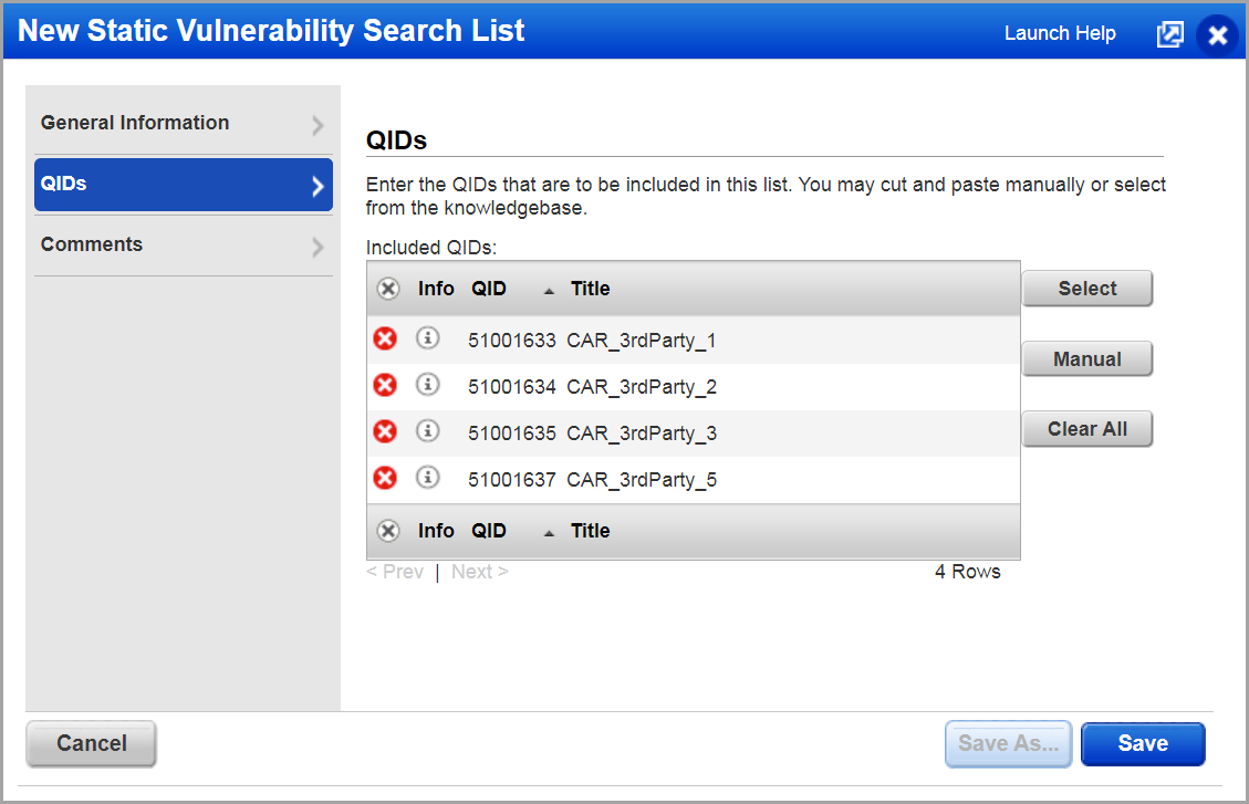 A static search list has a specific list of vulnerabilities (QIDs) that you select. Perform a search of the KnowledgeBase to find the QIDs you want, then add them to your static search list. When a static search list is used, only the QIDs saved in the search list are included in the action.