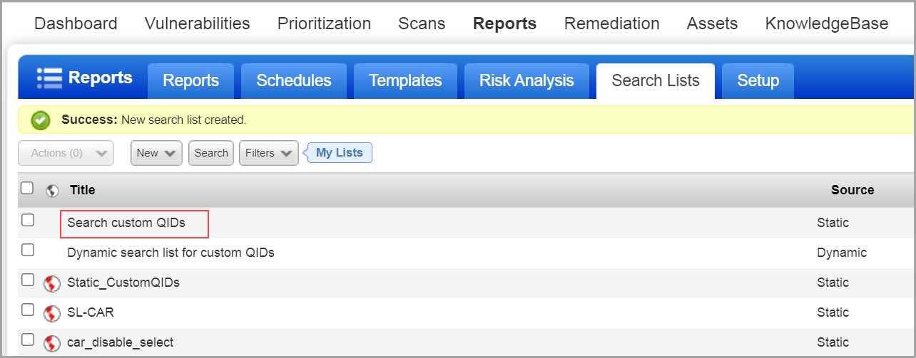 You can use this search list for reports, scans, or in knowledgeBase. See use case examples for when to use a Dynamic list vs. Static list.