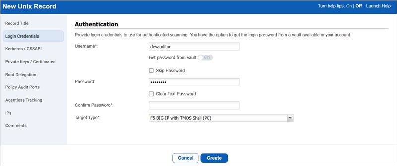 create /auth user qualys_scan partition-access add { all-partitions { role auditor } } prompt-for-password shell tmsh