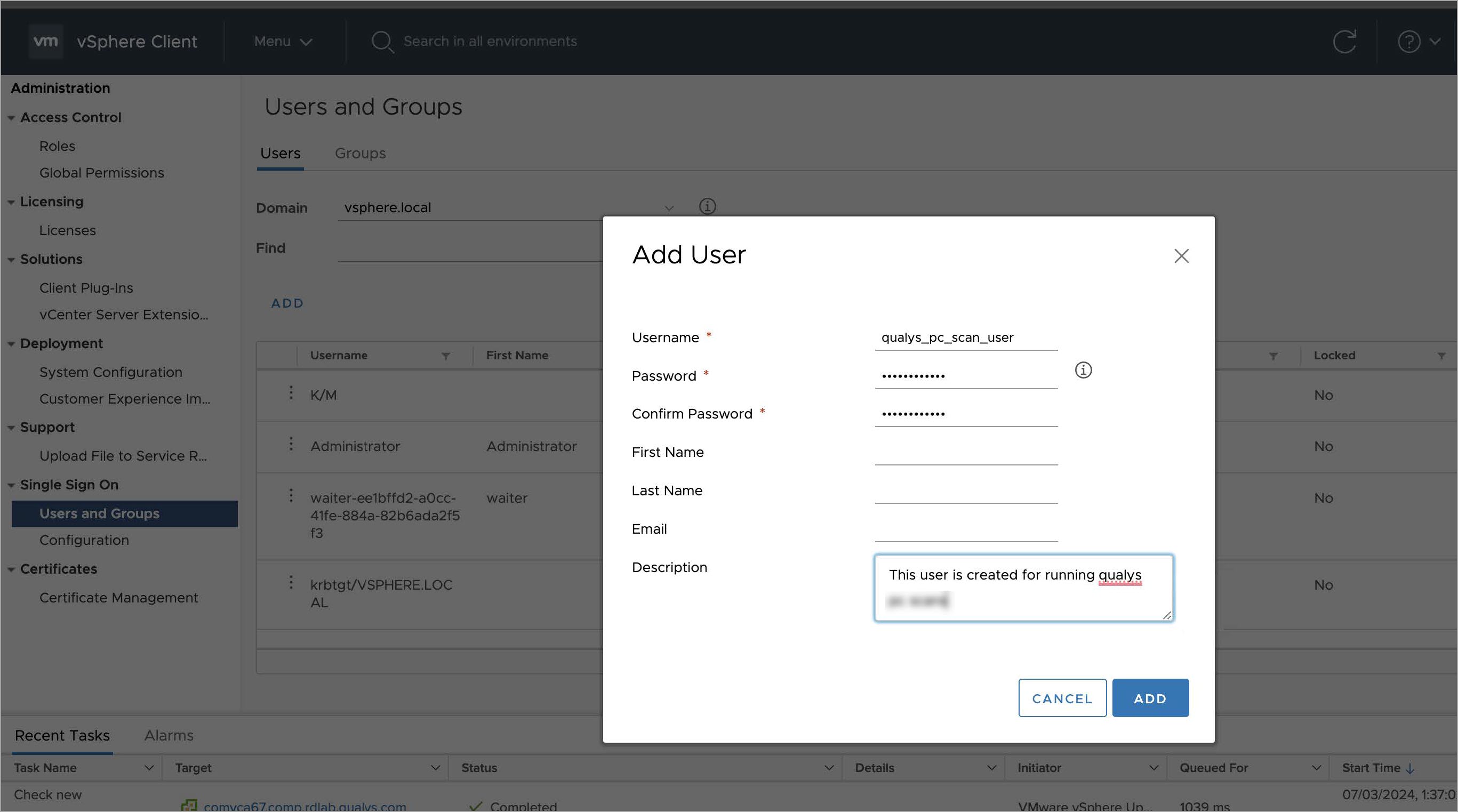 - Navigate to Single Sign On Users and in Users and Groups select Domain as vsphere.local. Create a