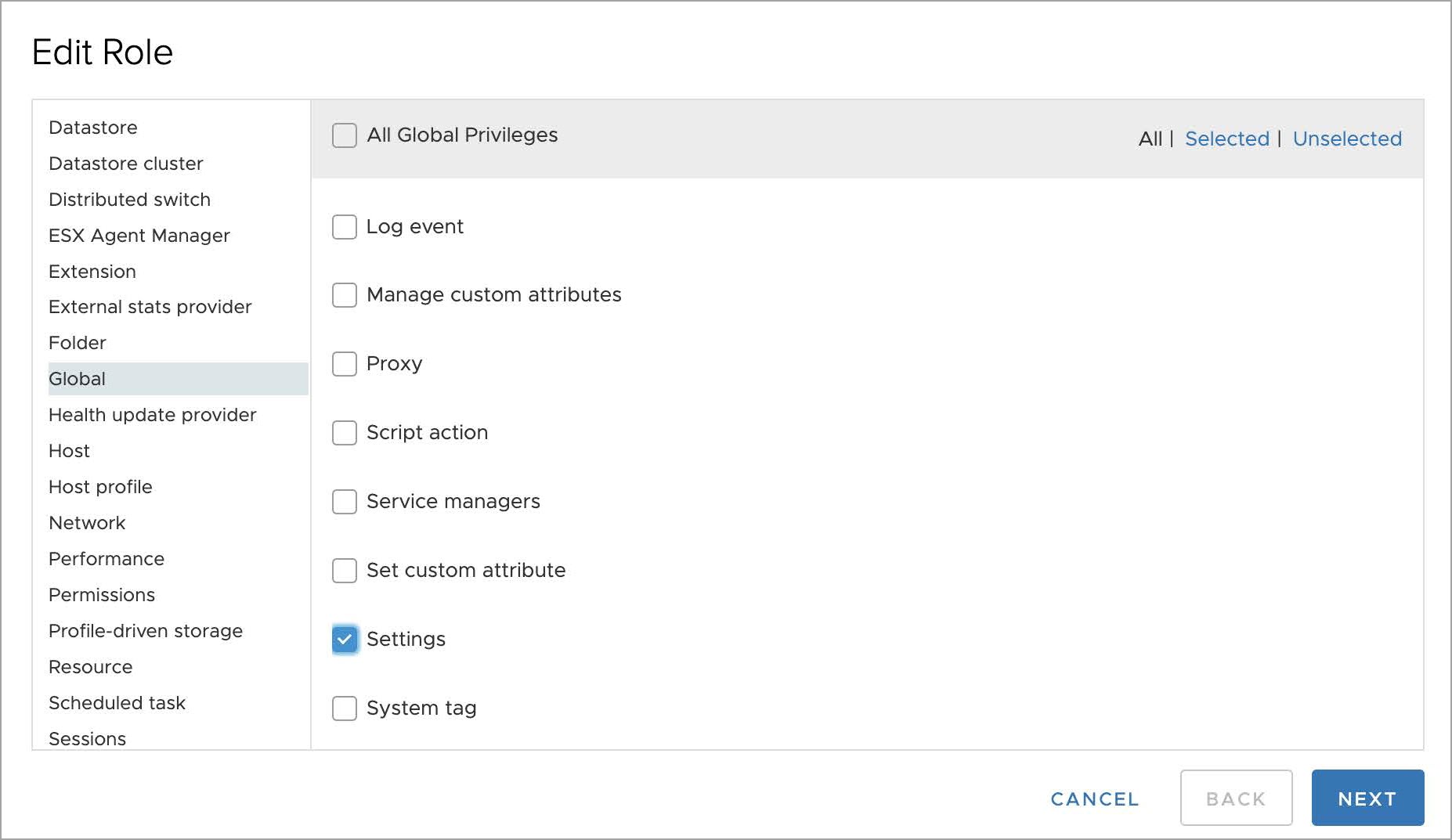 - Select Global from the privilege list and select Settings from the sub-privilege list.