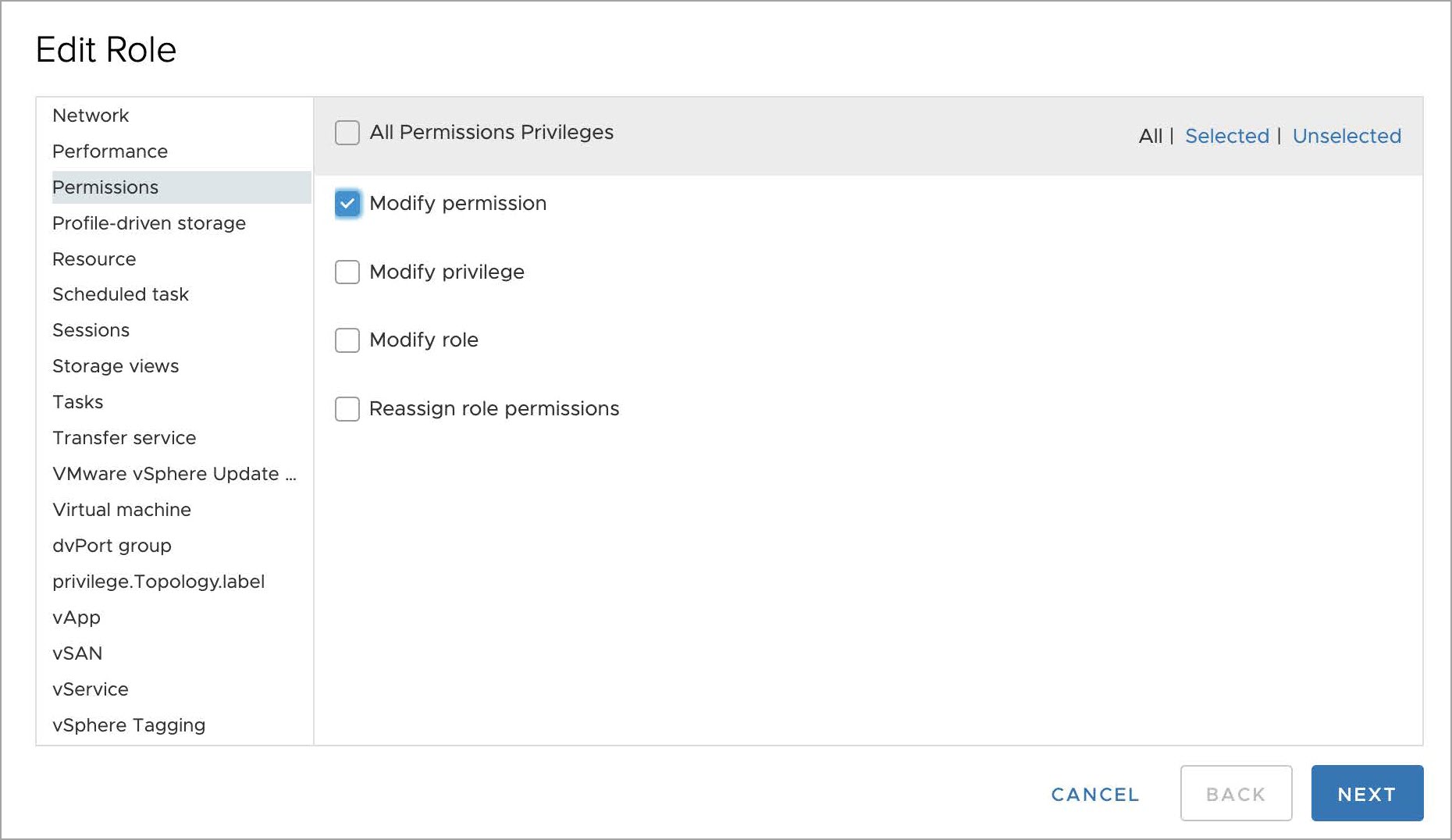 - Select Permissions from the privilege list and select Modify permission from the sub-privilege list.