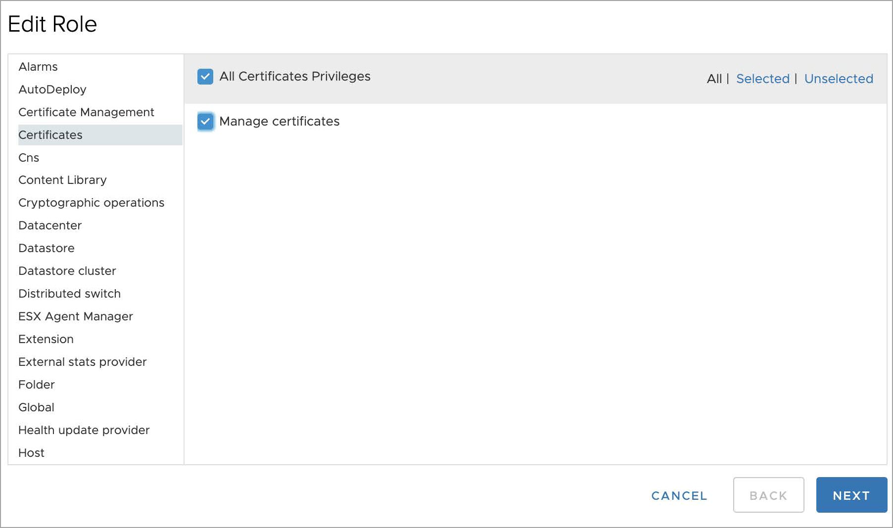 - Select Certificates from the privilege list and select Manage certificates from the sub-privilege list.