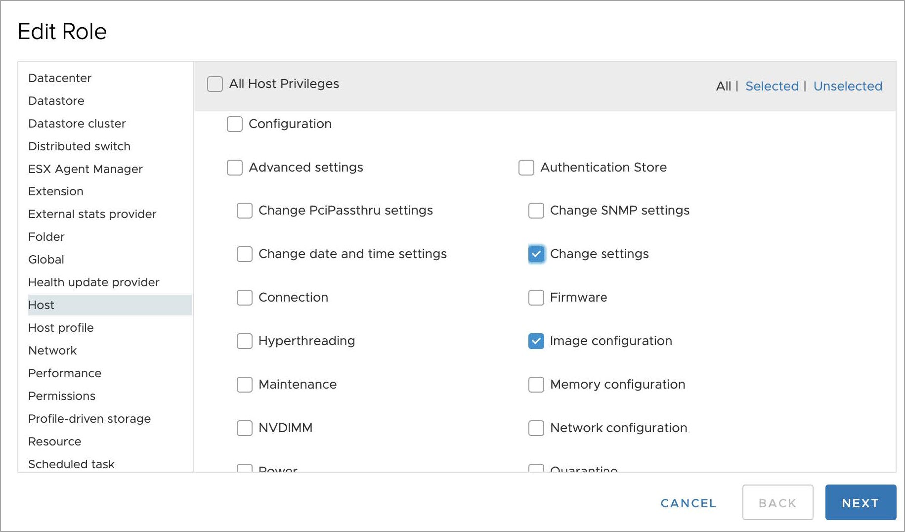 - Select Host from the privilege list under Configuration sub-privilege list select Change settings and
