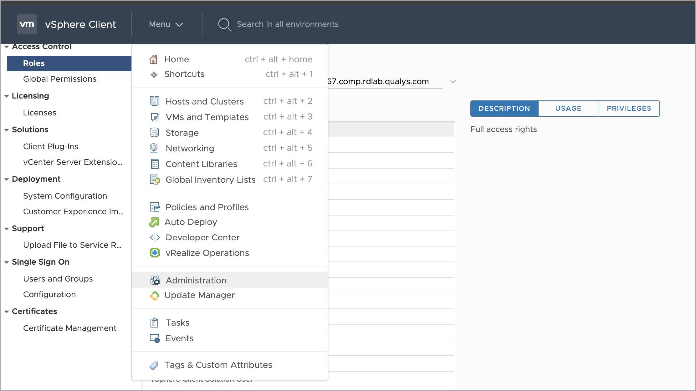 - Login to vSphere Client. Navigate to Menu > Administration.
