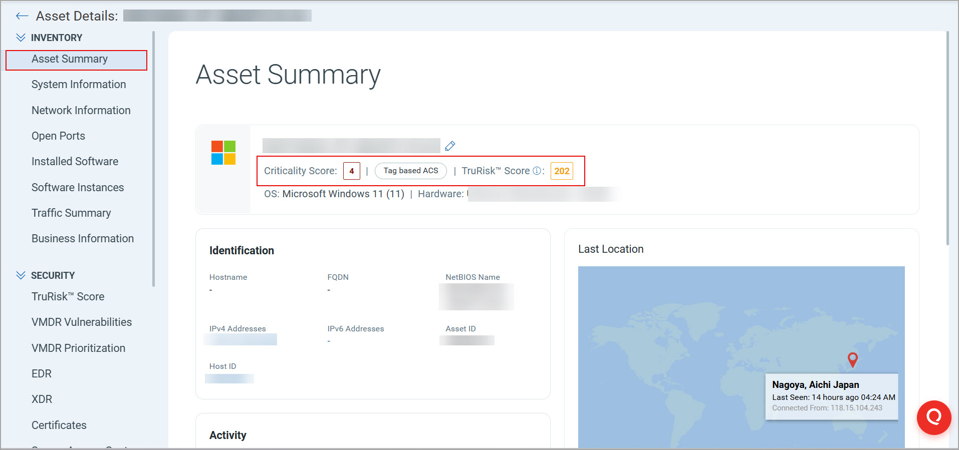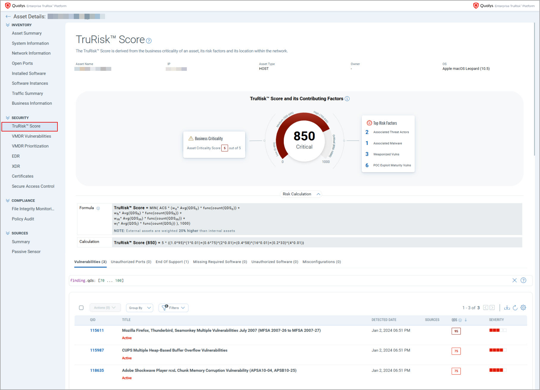 - Business Criticality: It is the Asset Criticality Score (ACS) of the asset. The range is between 1 and 5.