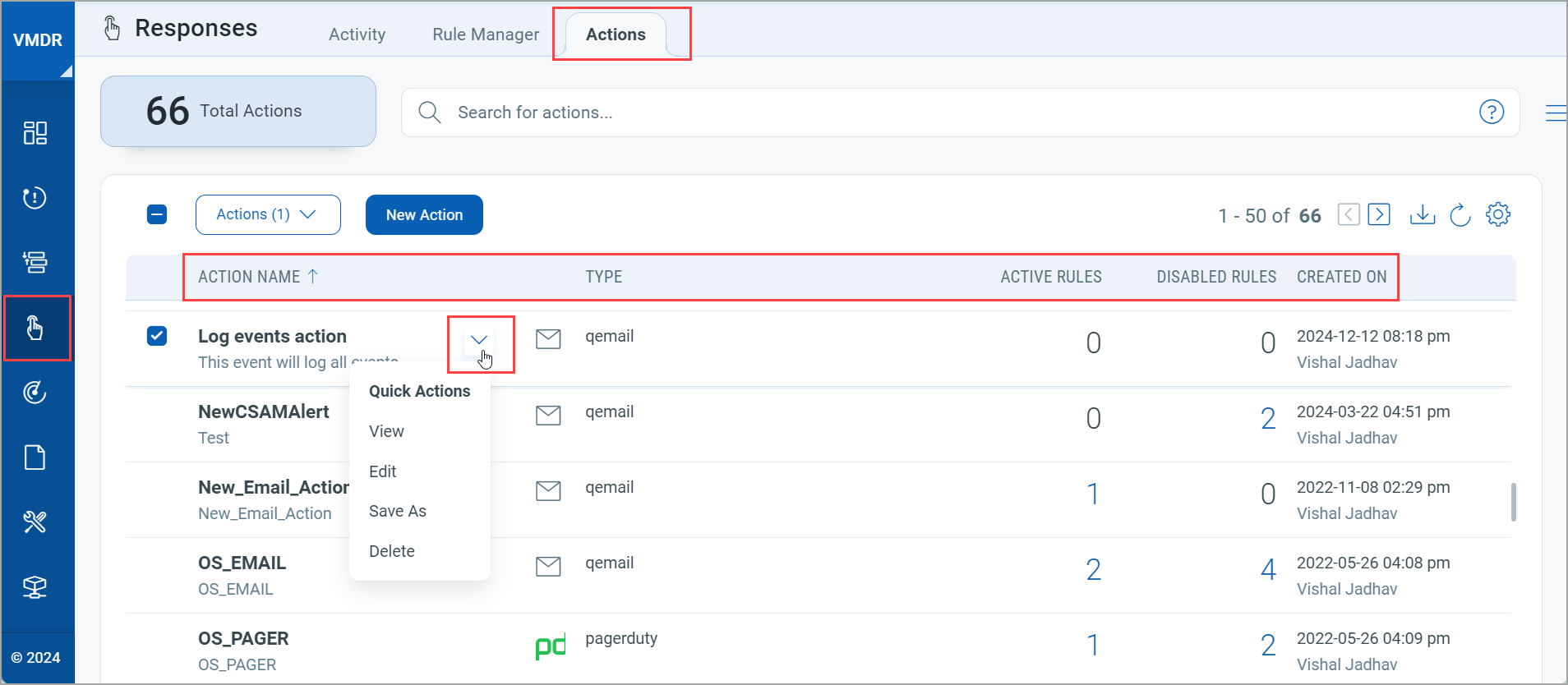 The Actions tab lists the Action Name, the Type of action, the number of active or inactive rules, and the Created On date and time of the rule. The list of actions is based on the Action Setting selected while creating a new rule from the Rule Manager.