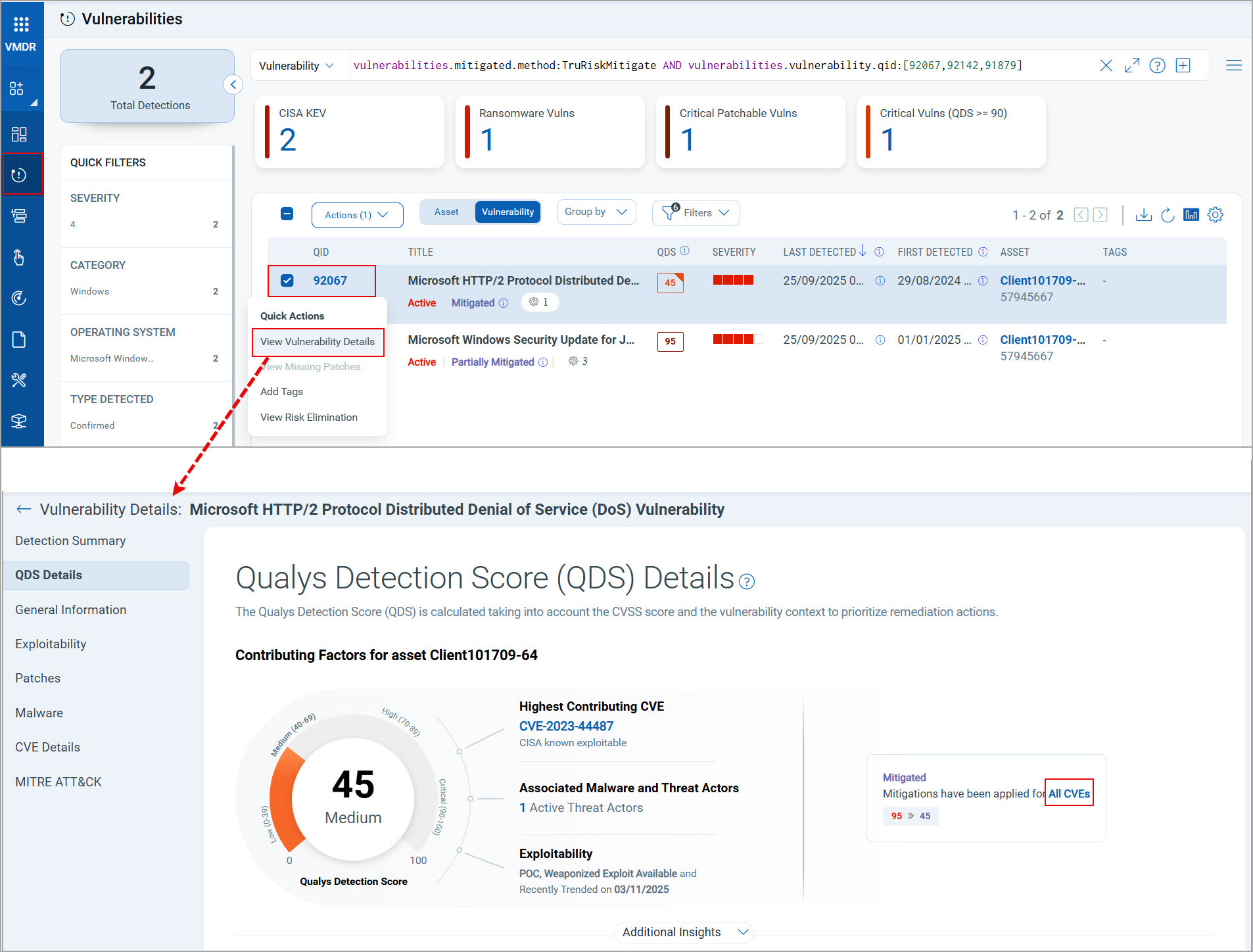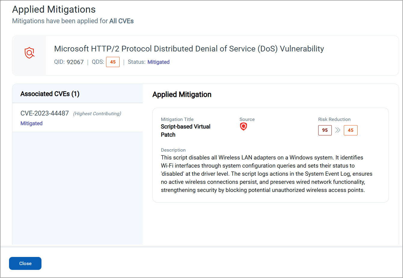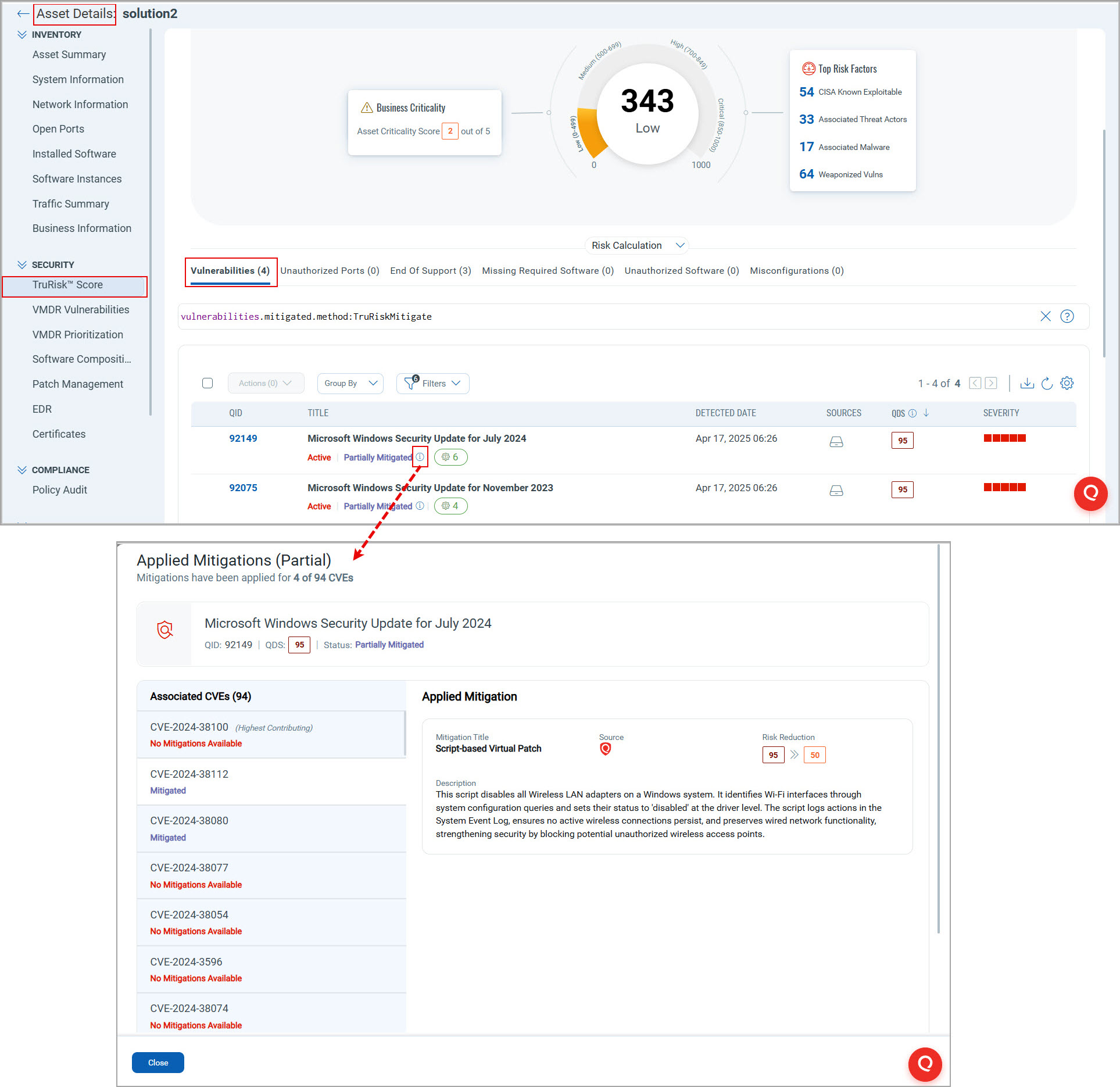 - Risk Reduction: a Qualys Vulnerability Score (QVS) of a CVE before mitigation and a reduced QVS after mitigation. The score quantifies the impact of mitigation. A reduced score indicates the score available after the mitigation is applied to a CVE.