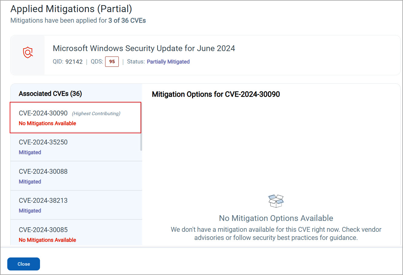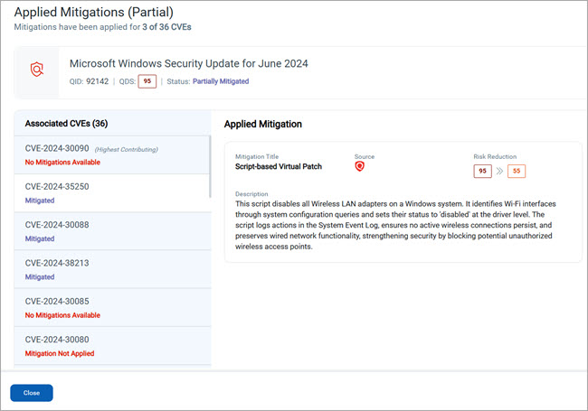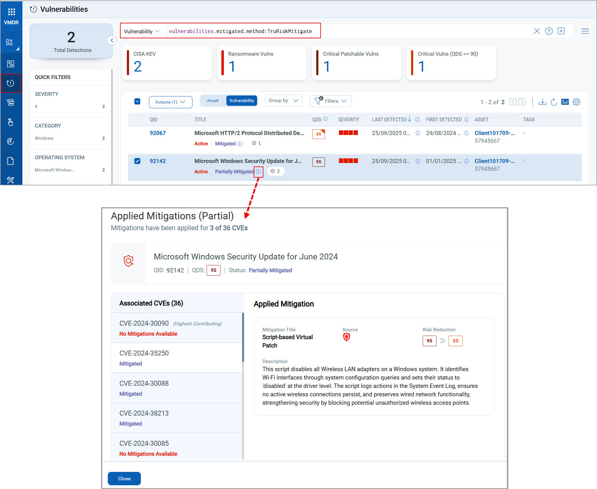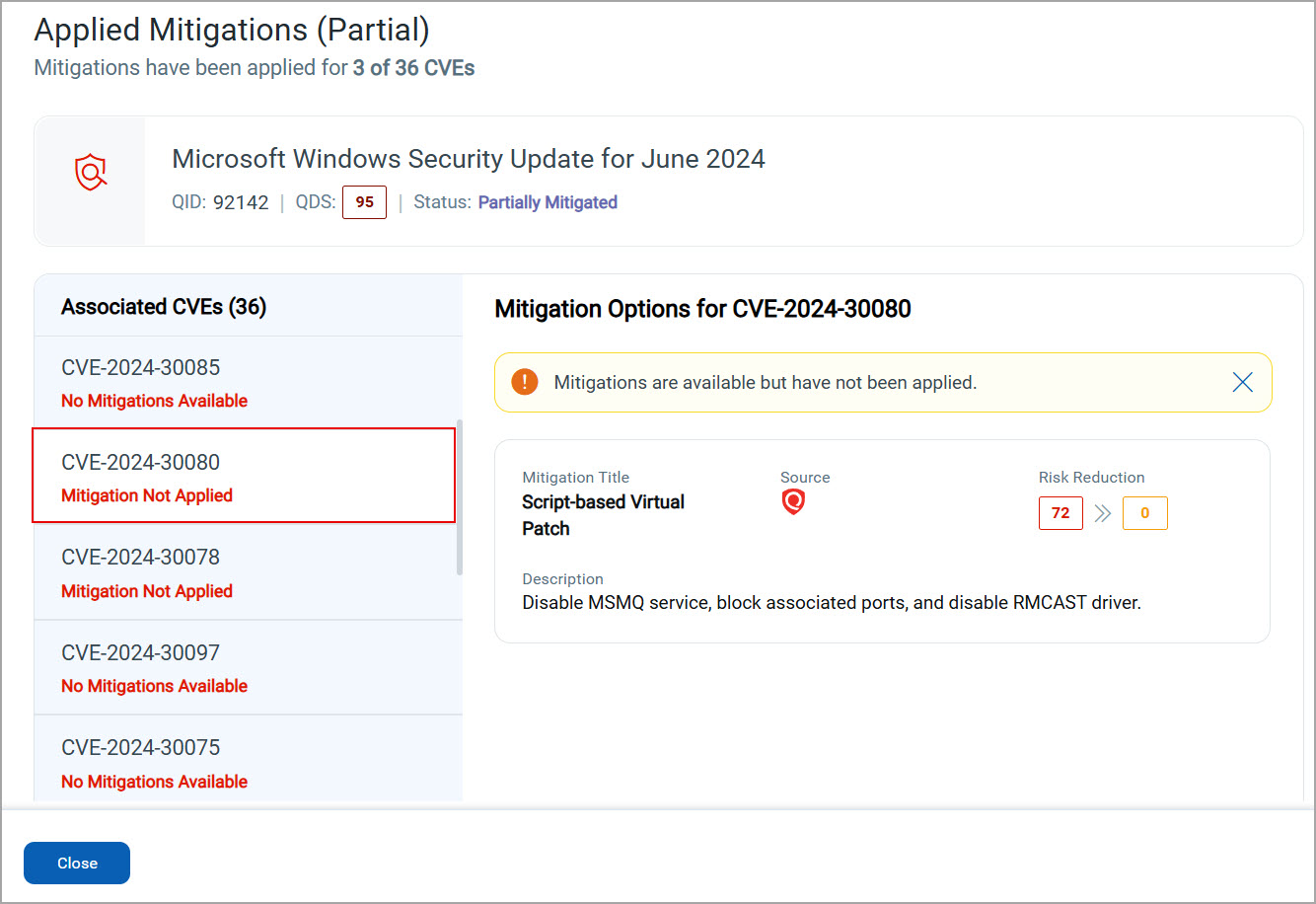 - Status: a mitigation status indicating whether a vulnerability is fully mitigated or partially mitigated for a QID. You can also check the mitigation statuses of CVEs related to the respective QIDs.