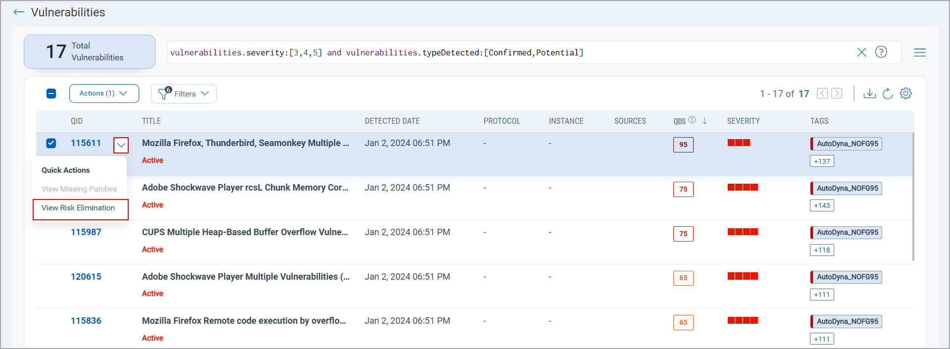 - To mitigate the QID, locate it, and then from the Quick Actions drop-down or Actions drop-down, click View Risk Elimination. This option navigates you to the Mitigation > Eliminations tab, where you can mitigate the selected QID.