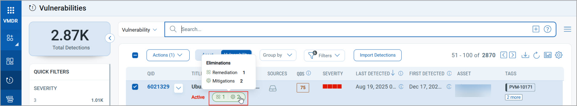 TruRisk™ Mitigation is integrated to strengthen risk management capabilities. Using the MTG application, you can mitigate vulnerabilities on Windows and Linux assets by creating mitigation jobs using actions and scripts. The mitigation and remediation counts on the Vulnerabilities Details page, previously accessible only to a limited set of VMDR users, are available to all users, regardless of their Patch Management or TruRisk™ Mitigate subscription status. This enhancement applies solely to vulnerabilities identified by Cloud Agents.