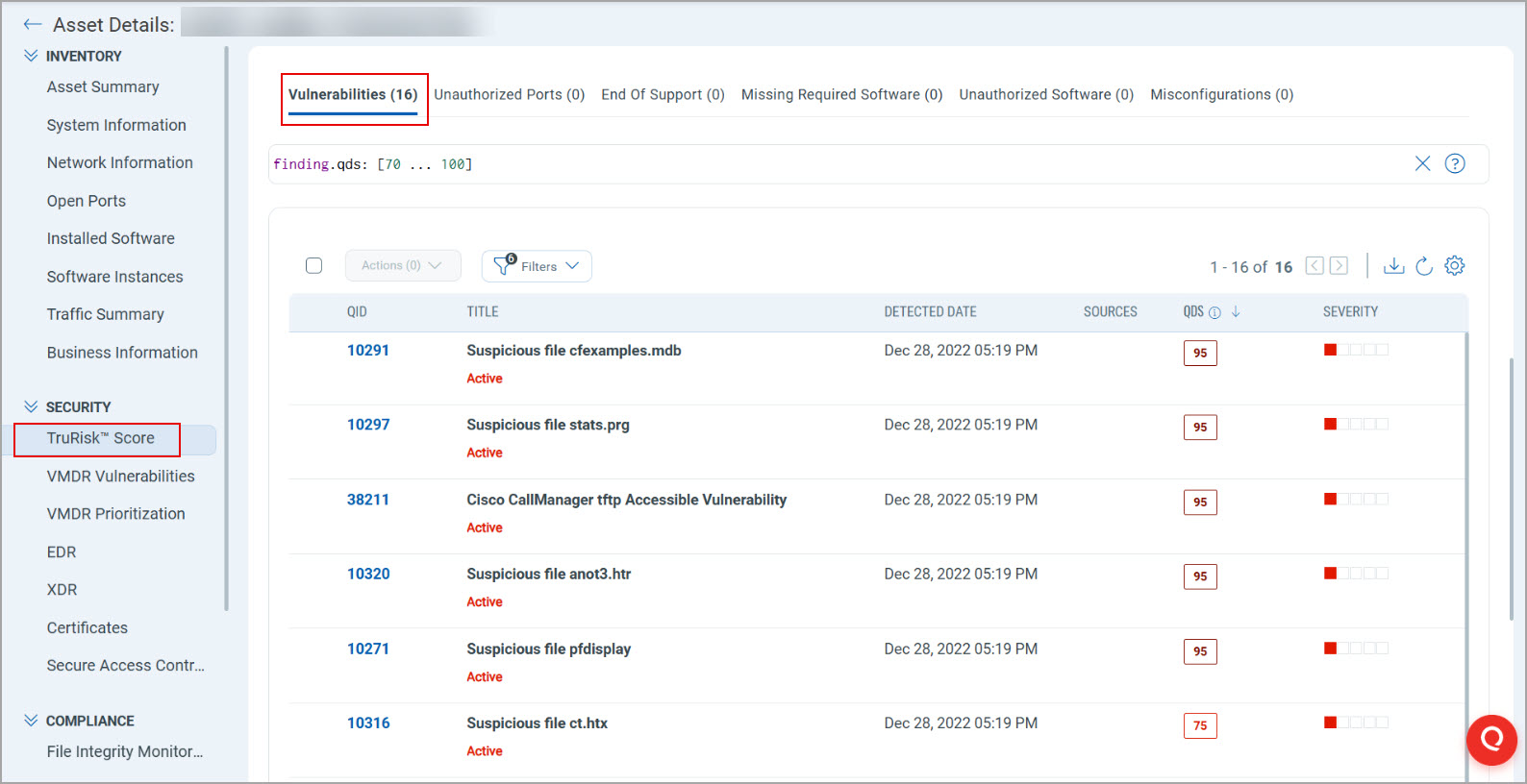 TruRisk™ Score: The TruRisk™ Score column displays the overall risk score assigned to the asset. For more information about TruRisk™, refer to Prioritize Vulnerabilities using Qualys TruRisk™.