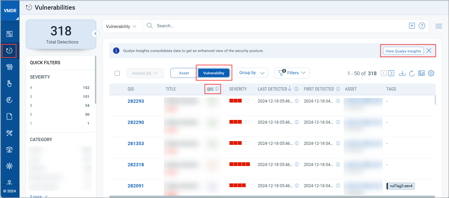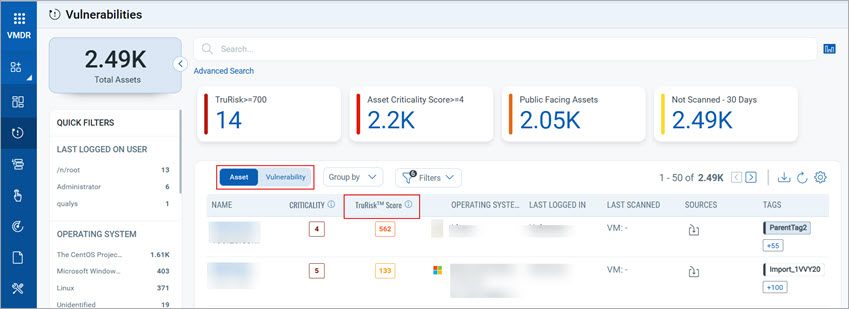 The Vulnerabilities tab gives you a complete view of vulnerability posture from an asset and vulnerability point of view. Assets identified by cloud agents and sensors are listed in the Vulnerabilities tab of the VMDR application. The Asset and Vulnerability field under the Vulnerabilities tab provides you with the asset inventory and the list of vulnerabilities detected on the assets. The Asset field gives a detailed TruRisk™ Score report that helps you prioritize and remediate the asset risks. The Vulnerability field provides the Qualys Detection Score (QDS) and the Severity of a vulnerability.