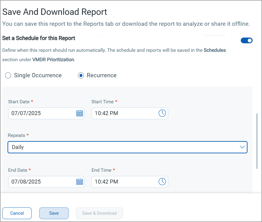 The Save & Download button is enabled only after you have generated the VMDR Prioritization report.