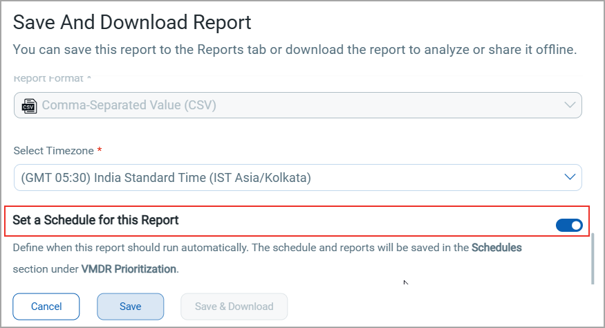 On clicking Save, the VMDR prioritization report is saved to the Reports section. On clicking Save & Download, the VMDR Prioritization report is saved to the Reports section and downloaded to your local system.
