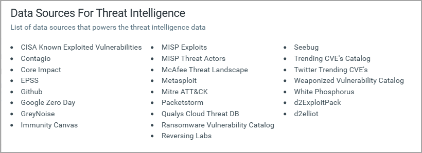 - Threat intelligence from over 25 global sources, covering exploit activity, malware associations, ransomware use, and known threat campaigns.