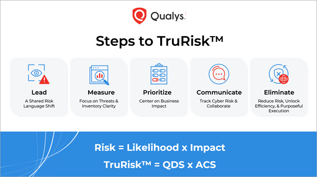 The Qualys TruRisk™ Score quantifies asset risk using a comprehensive formula that combines asset criticality, vulnerability severity, and external exposure factors.
