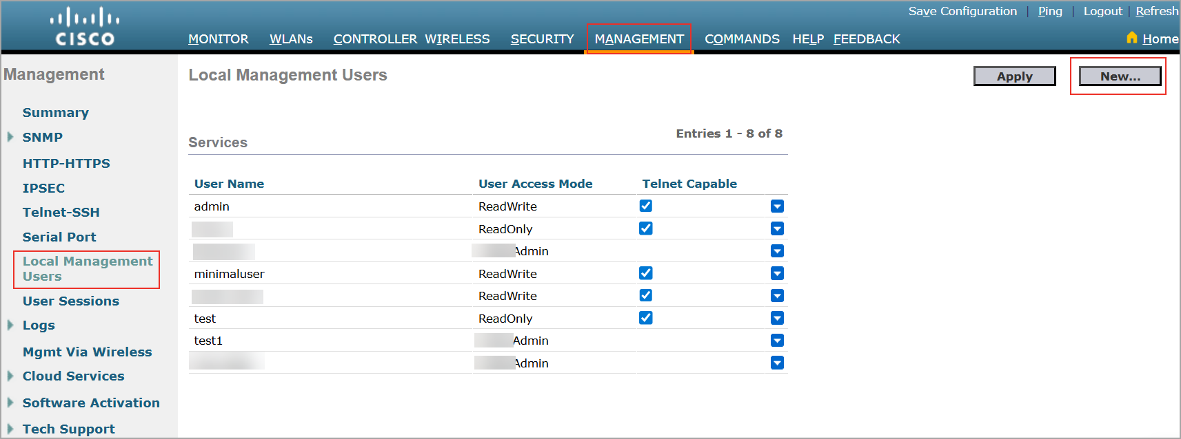 - Click Advanced > Management > Local Management Users > New.