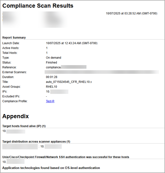 Red Hat Enterprise Linux 10.x is now listed under Application technologies found based on OS-level authentication in the Appendix section of a compliance scan result.