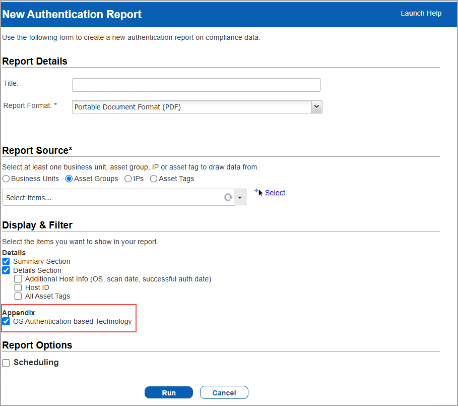 To display all OS authentication-based instance technologies per host, including Oracle Directory Server, in your authentication report, go to Reports > New > Compliance Report > Authentication Report and under Appendix, enable OS Authentication-based Technology option.