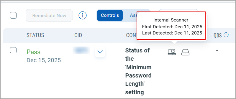 - If you hover over any of the icons, scanner or agent, you can see the name of the source (scanner or agent), the date on which the control was first detected in a scan, and the date on which it was last detected in a scan.