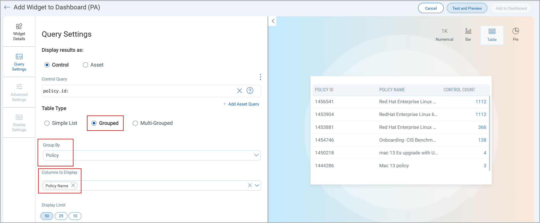 To create a new widget that displays all policy details, navigate to, Dashboard > Add Widget > Build your Widget > Query Settings > Select Table > in Display results as: select Control > Under Table Type select Grouped > In Group By select Policy.