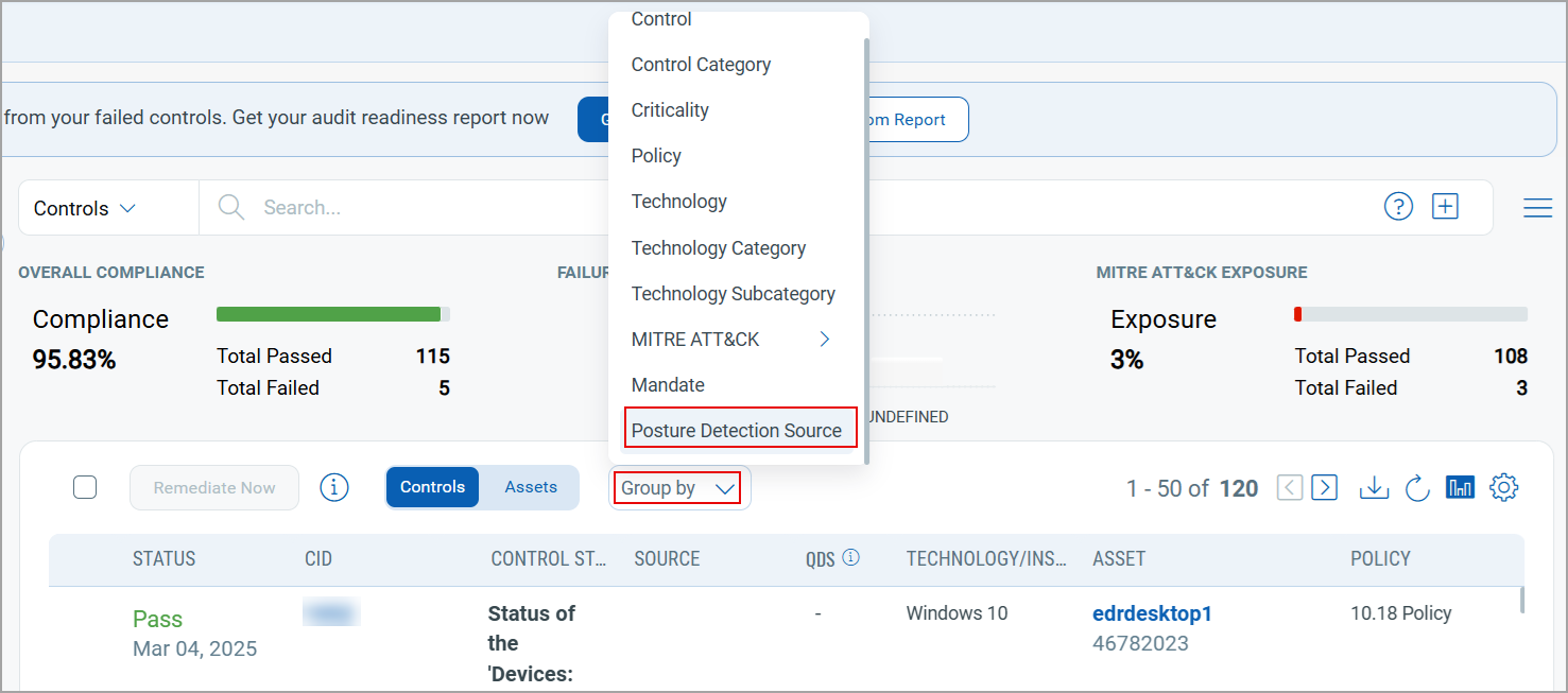 - In the Group by option, you can now filter controls or assets by Posture Detection Source. This filter option is available for both Controls and Assets.