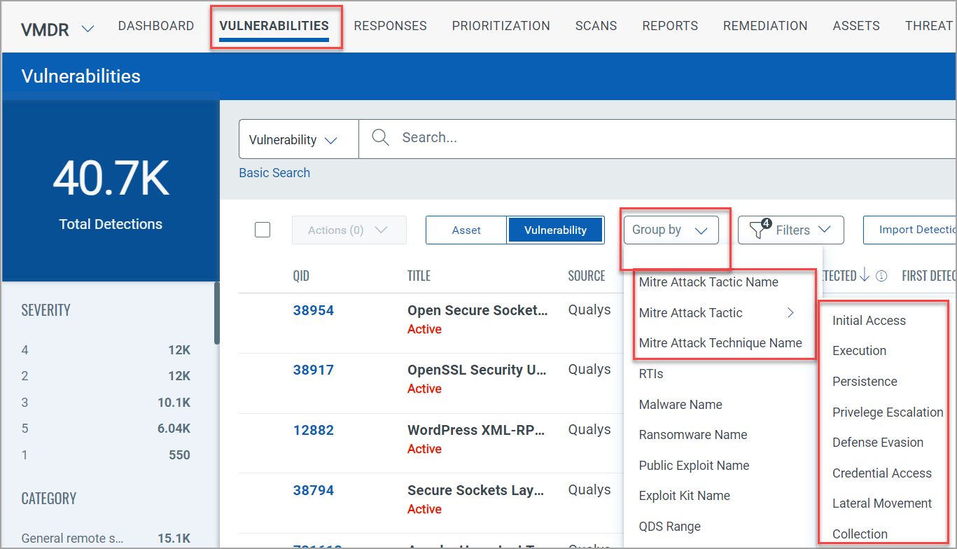 The following screenshot highlights all three types of GroupBy options for MITRE ATT&CK under the Vulnerabilities tab:
