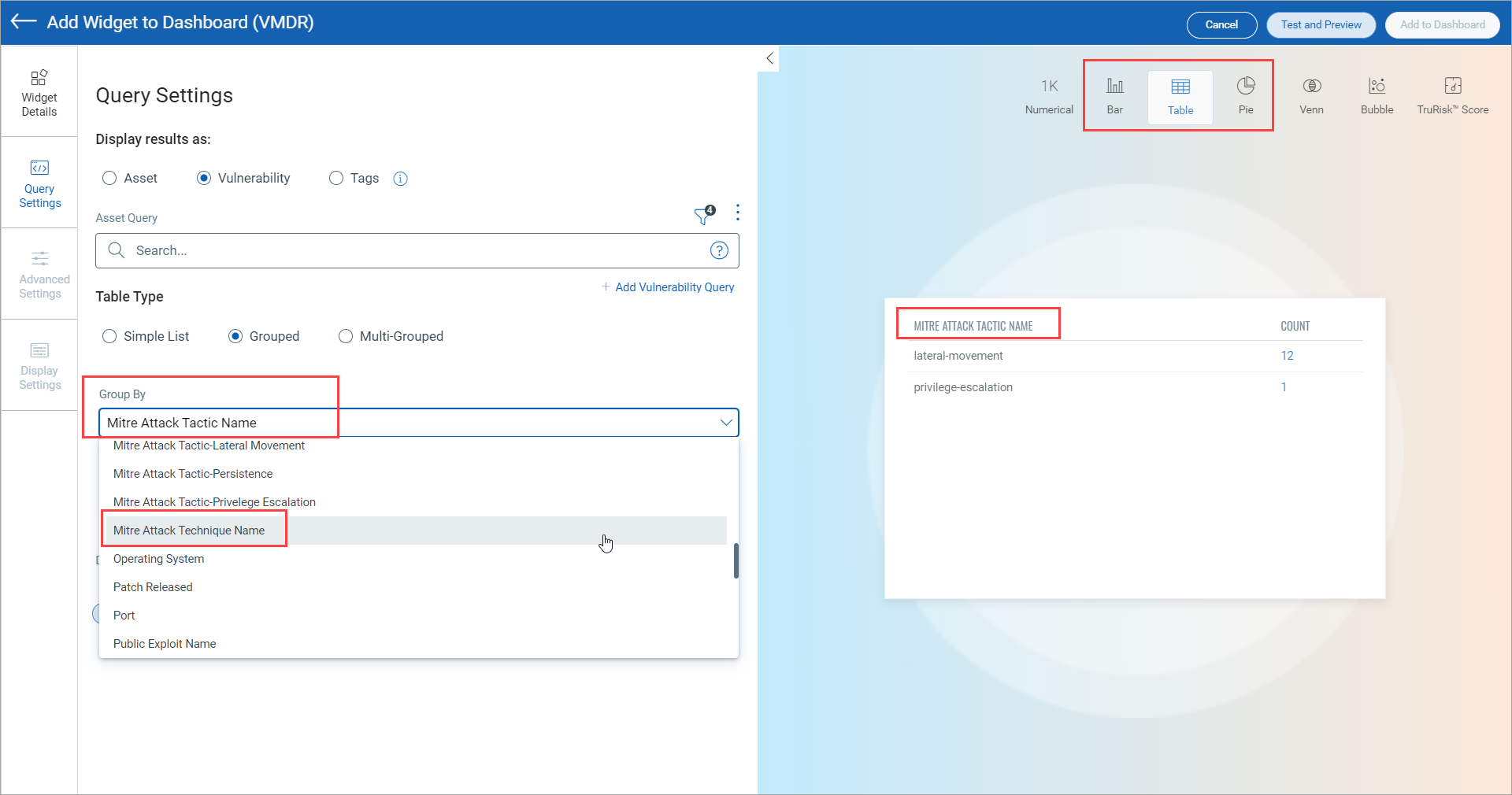 In VMDR Release 0.8.0, we simplified the GroupBy results for MITRE Tactics and Techniques. In our latest release, we have enhanced the GroupBy results for MITRE Tactics and Techniques by introducing two new options. These options allow you to analyze all Tactic and Technique Names in Bar, Pie, and Table charts.