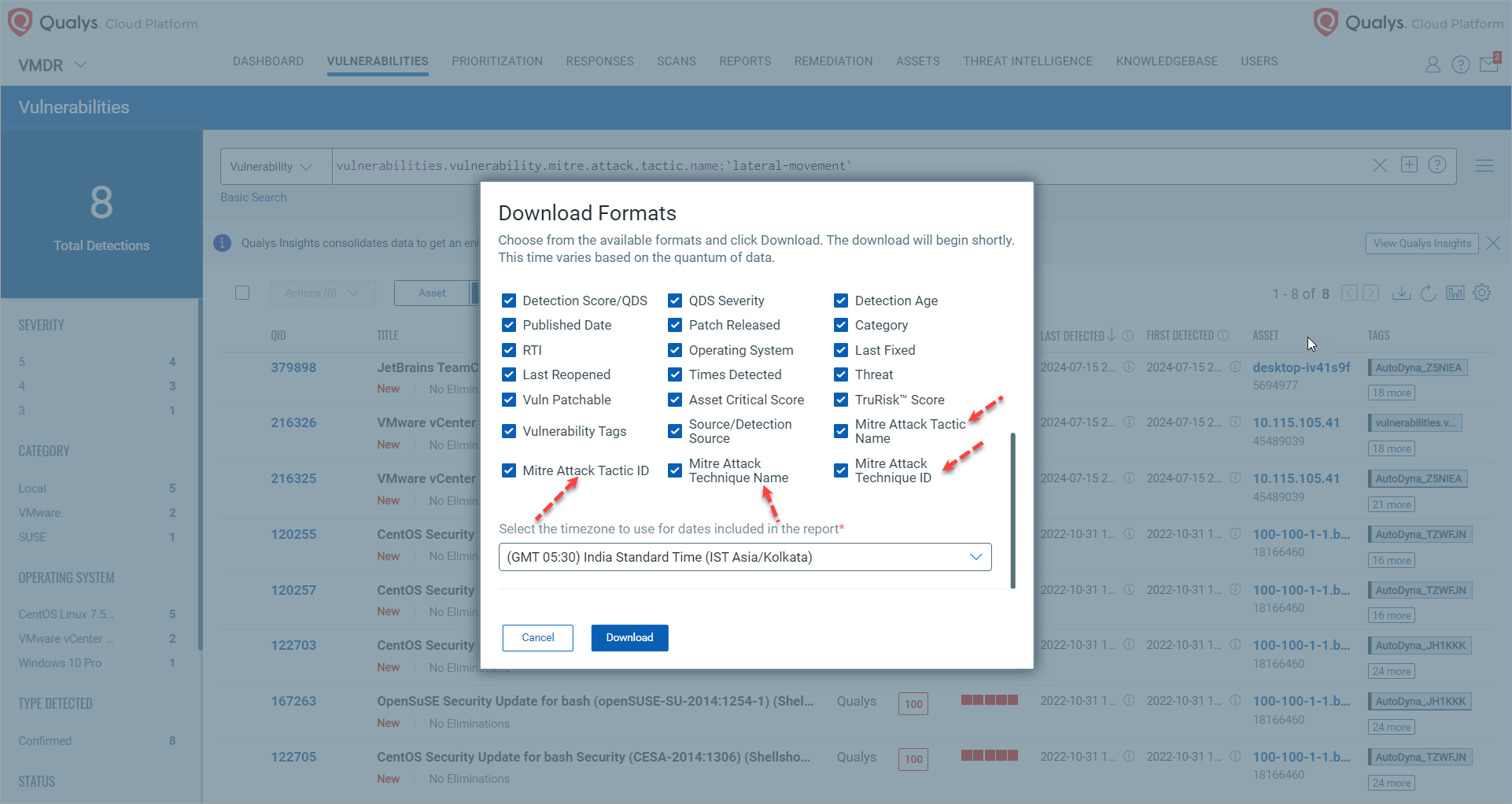 The QID option in the CSV report format now offers additional fields related to the MITRE ATT&CK framework.