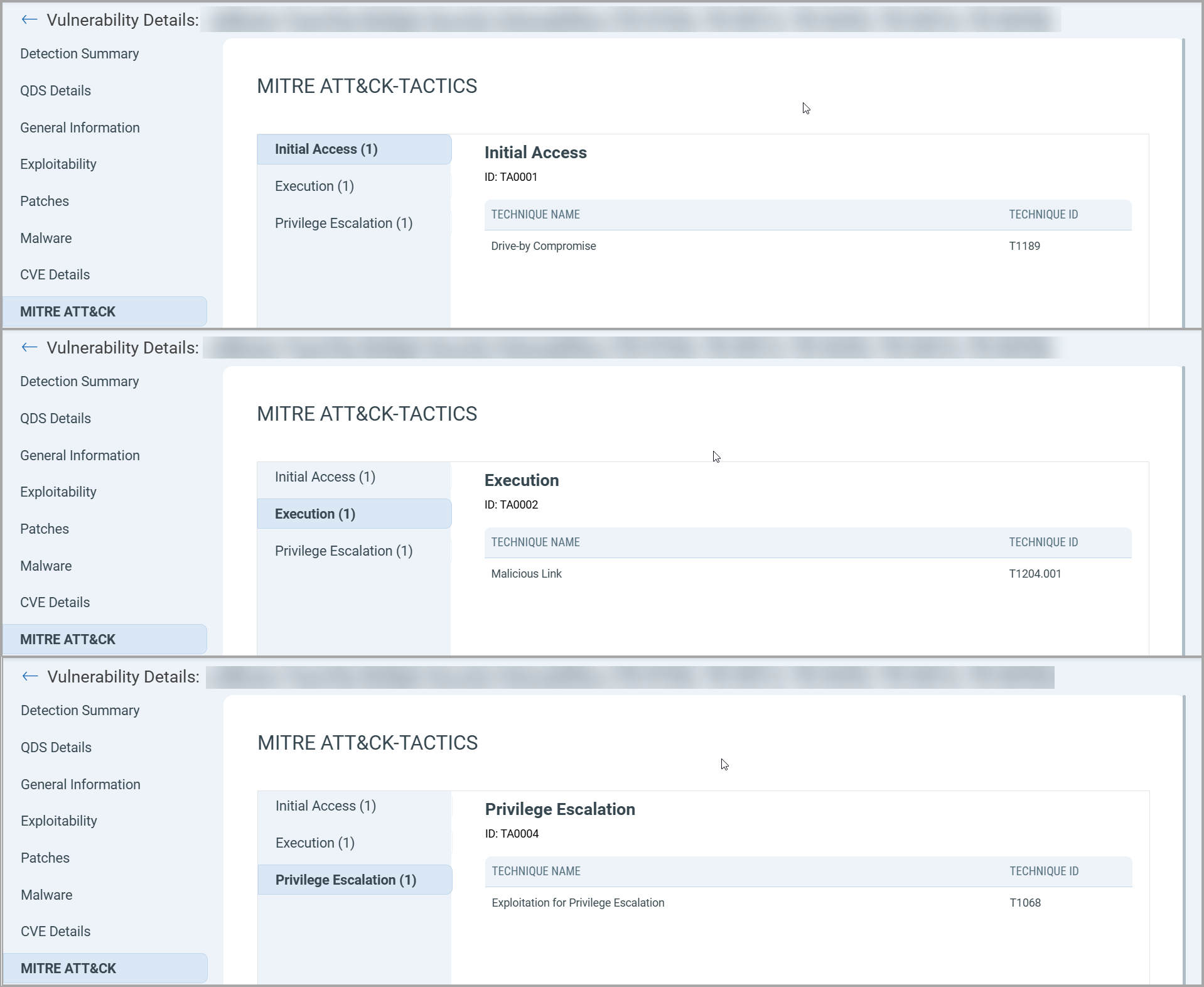 To see this information, go to Vulnerabilities > use any MITRE ATT&CK Group by filter > click a QID in the filtered view > click MITRE ATT&CK. You will find insights into the related Tactics and Techniques, including their names and IDs.