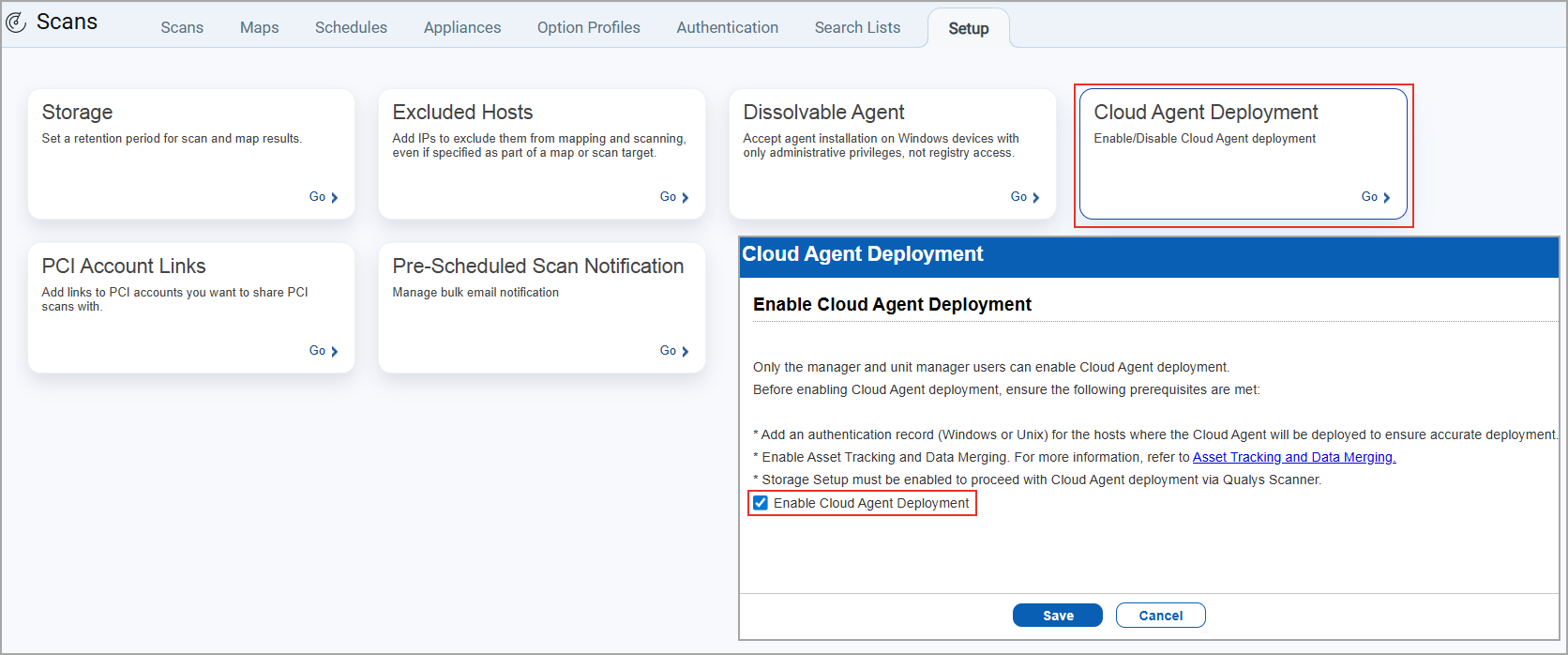 To enable Cloud Agent Deployment, go to Scans > Setup > Cloud Agent Deployment. Cloud Agent Deployment can be enabled by either a Manager or Unit Managers. Once enabled by one, all Manager, Unit Manager users of that subscription can launch the deployment scans.