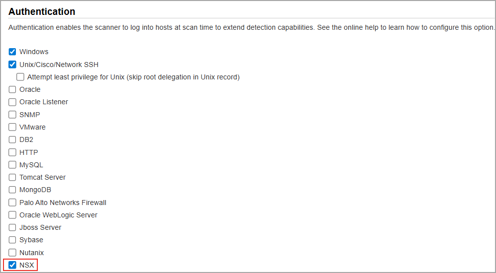 We have also added VMware NSX checkbox under the Authentication field (Scans > Option Profiles > New > Option Profile > Scan). You must create an option profile in the VM/VMDR to select the authentication type for scanning. This authentication enables the scanner to log in to hosts during scanning, thereby extending its detection capabilities.