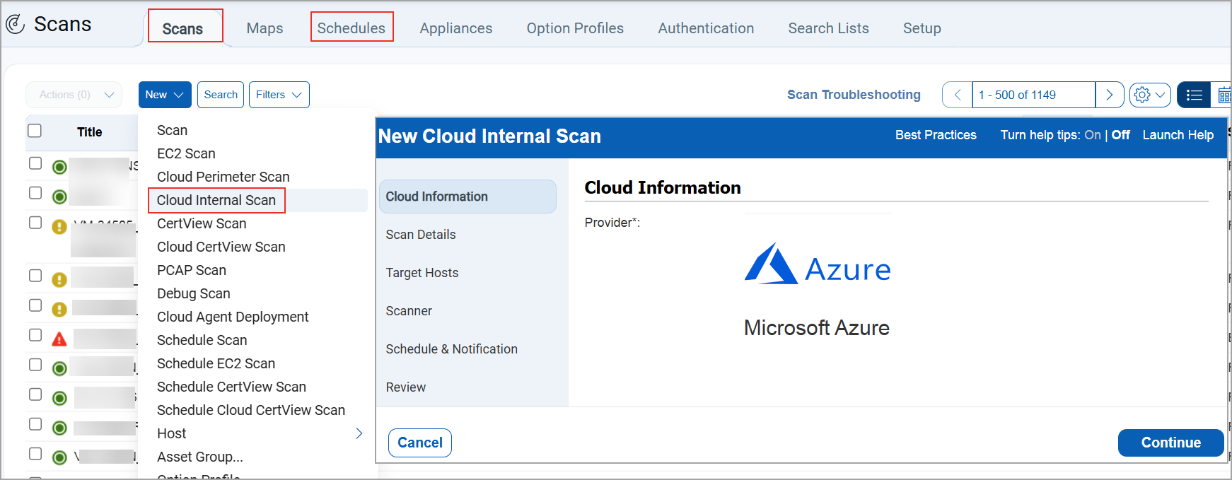 - When you create a new scan (Scans > Scans/Schedules > New > Cloud Internal Scan). You can view Azure Internal Scan in the Cloud Internal Scan window.