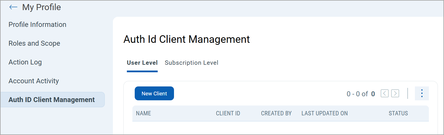 To access the Client Management tab, navigate to your profile icon, located at the top-right corner, and click View Profile > Auth Id Client Management tab.