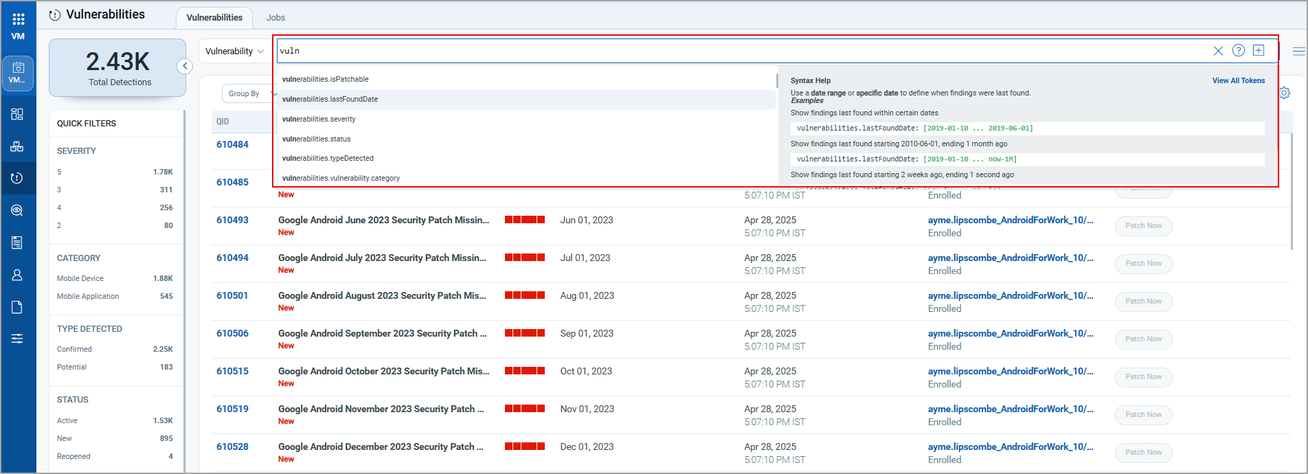 We have now implemented Qualys Query Language (QQL) token standardization across all Qualys applications. As part of this enhancement, both common and VMDR Mobile-specific tokens are updated with new token names that follow a standard, consistent nomenclature.