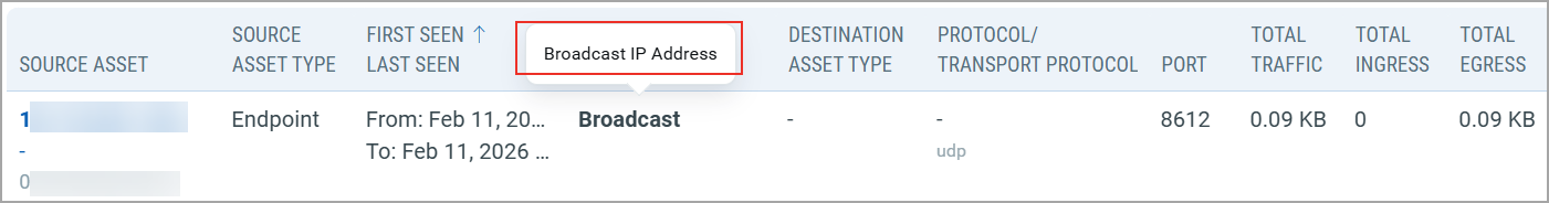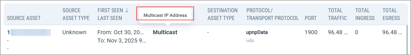 - Source asset - Source asset type - When the asset was first and last seen communicating on the network - Destination asset - Destination asset type |