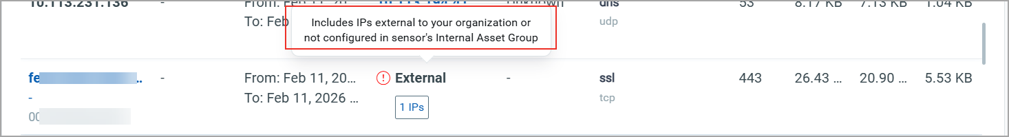 An External IP is defined as any IP that is outside the organization's network or not configured in the organization's internal asset group. Monitoring external IP communications with internal IPs helps you to detect suspicious connections and identify potential security threats.