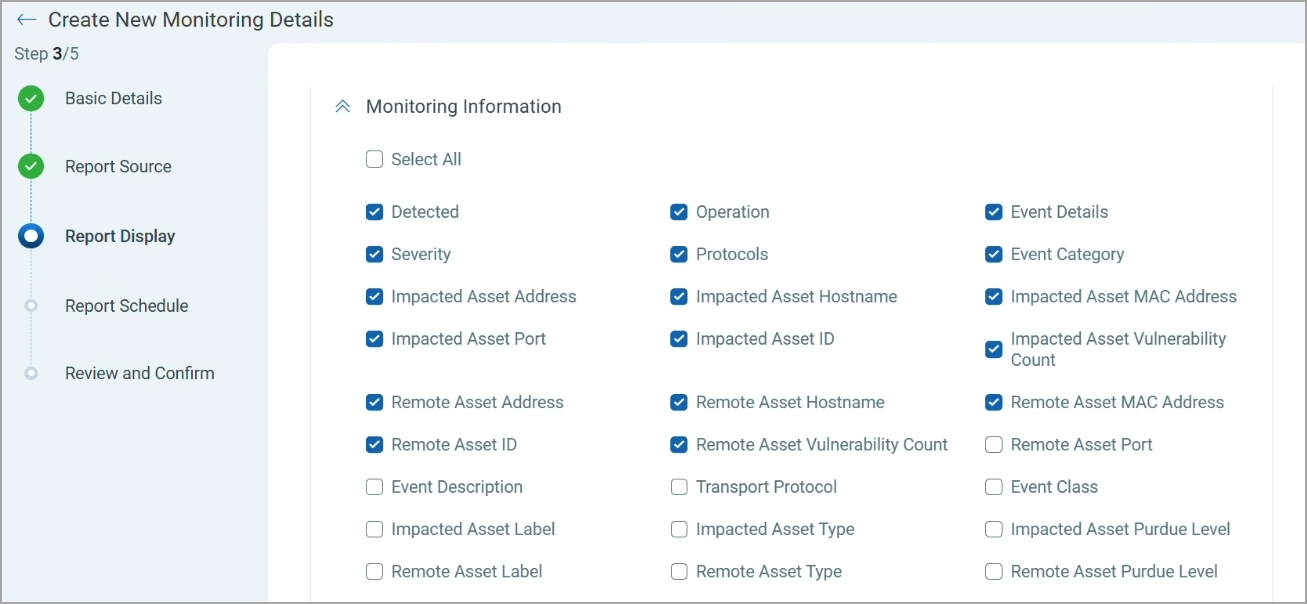 - On the Report Display page, select the Monitoring Information you want to be displayed in the report.