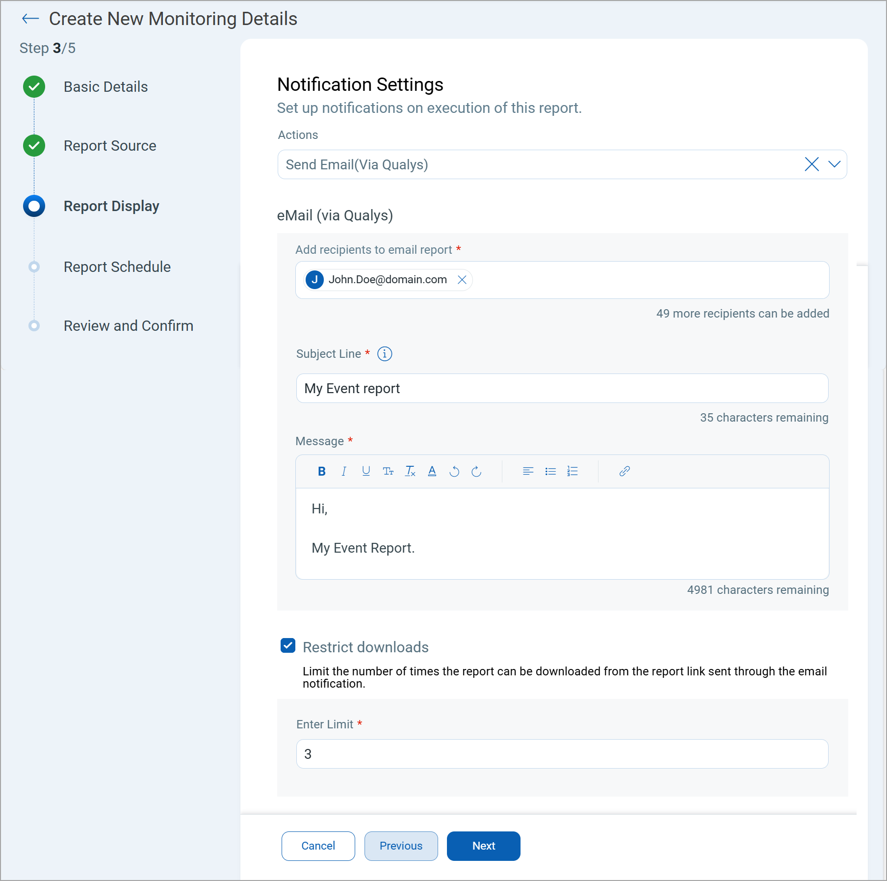 - Select the Restrict downloads check box to limit the number of times the recipient can download the report using the download link sent through the email notification.