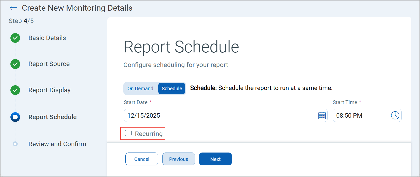 The Recurrence Date denotes the date of the month the report generates at the specified Start Time.The Start Date indicates when the schedule begins.