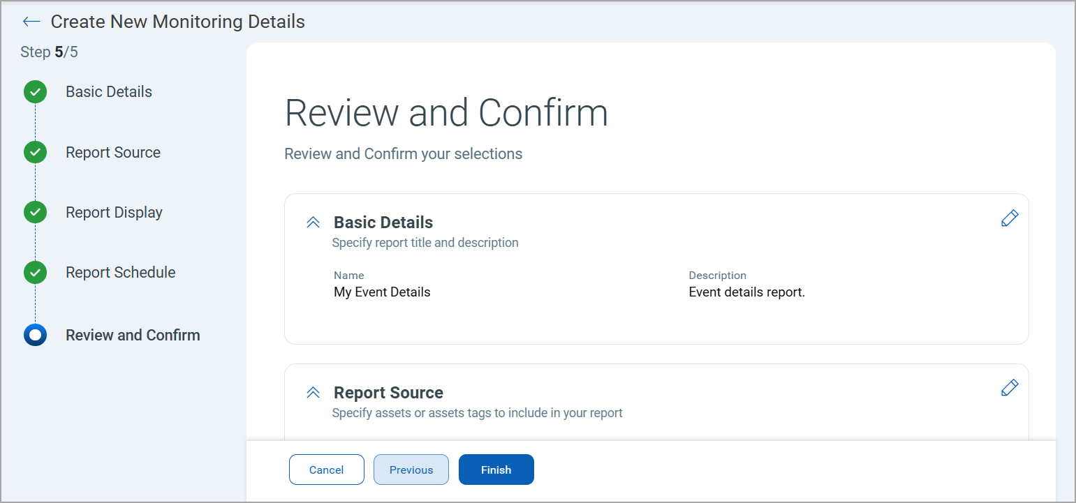 and edit the details. - Review the details and click Finish to create the report.