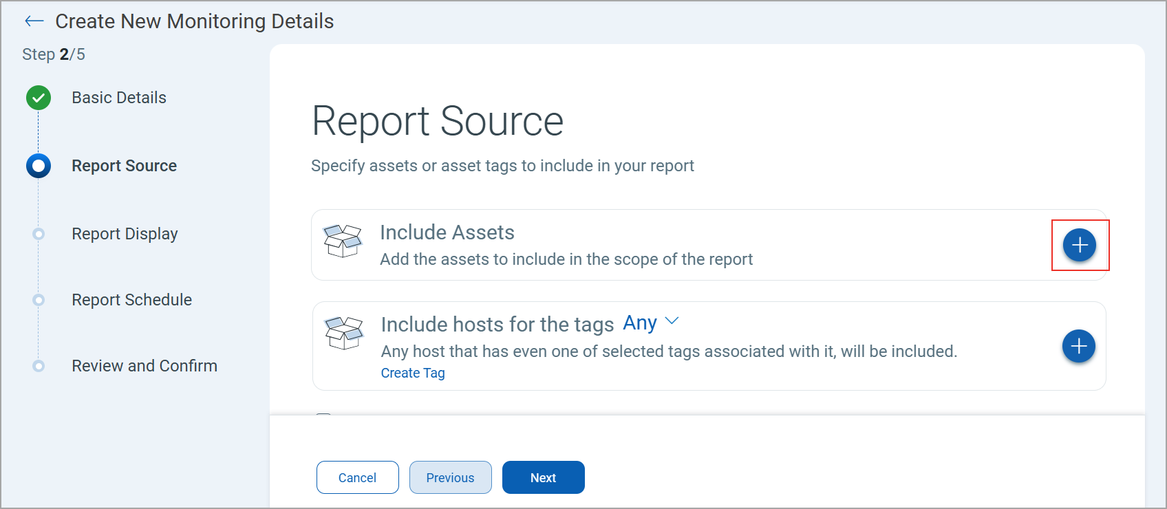 In the Report Source page, you can define the scope of the assets to be included in the report. You can select assets with asset name, asset tag, or using a search query.