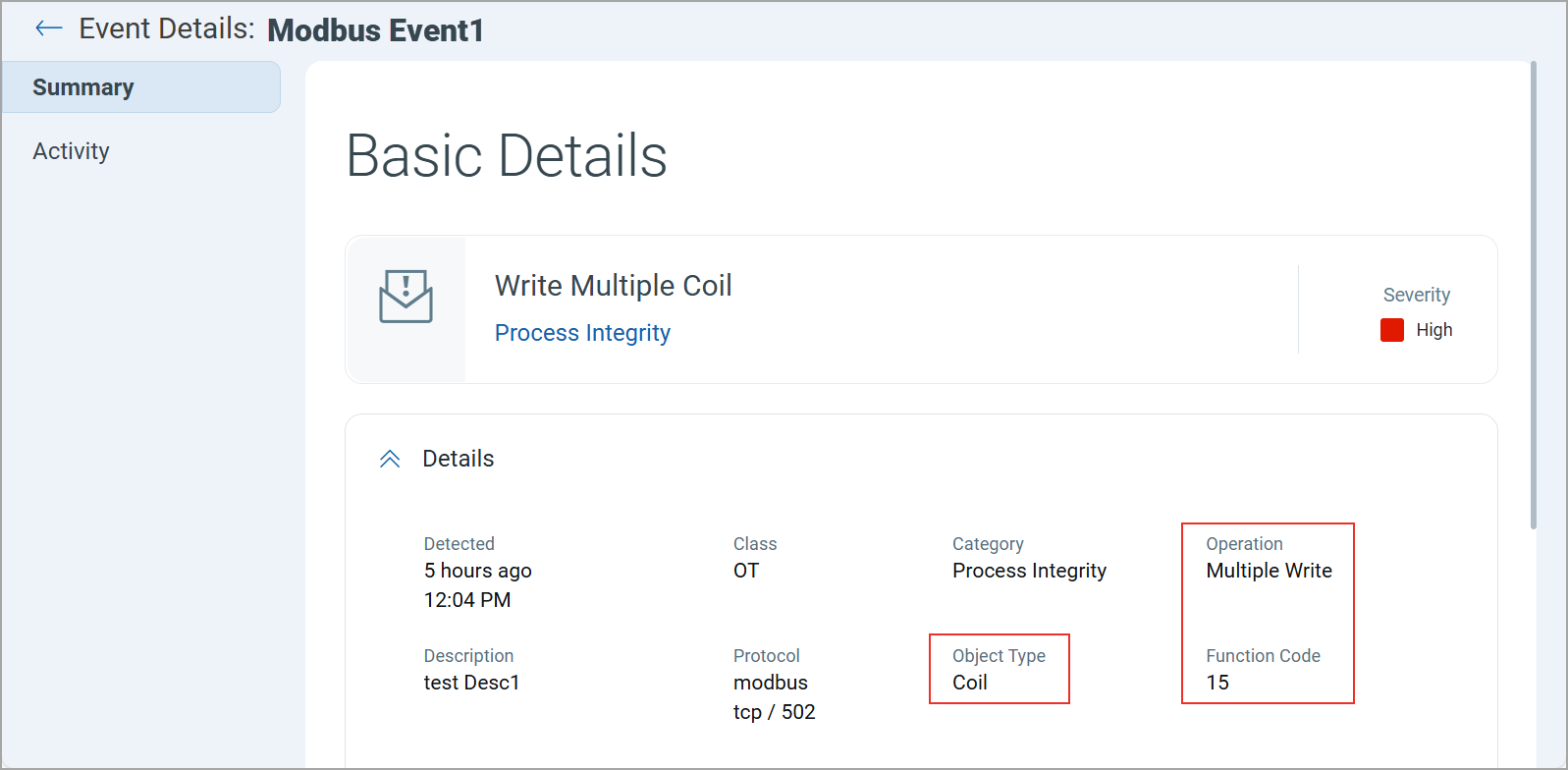 You can view these details on the Event Details > Activity tab of any Modbus event.